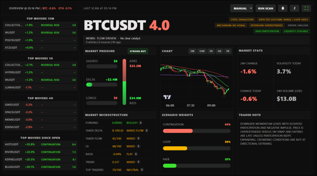 Structures market activity across multiple windows into a ranked, actionable shortlist. Ingests and normalizes multi-source data—price, flow, open interest, funding, and positioning—through a real-time processing pipeline to produce high-quality inputs for decision and execution systems.